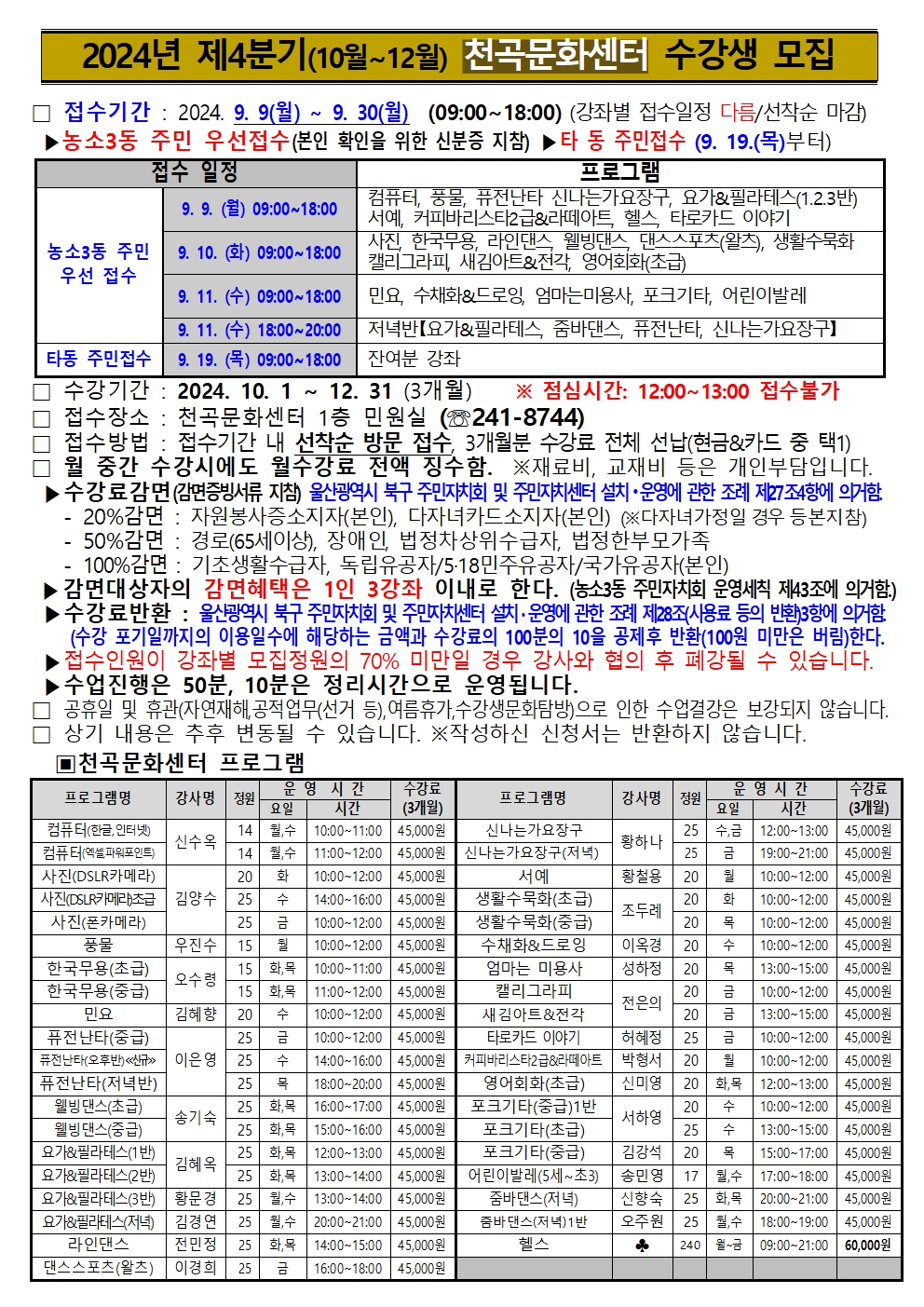 2024년 4분기 농소3동 주민자치센터 및 천곡문화센터 수강생 모집