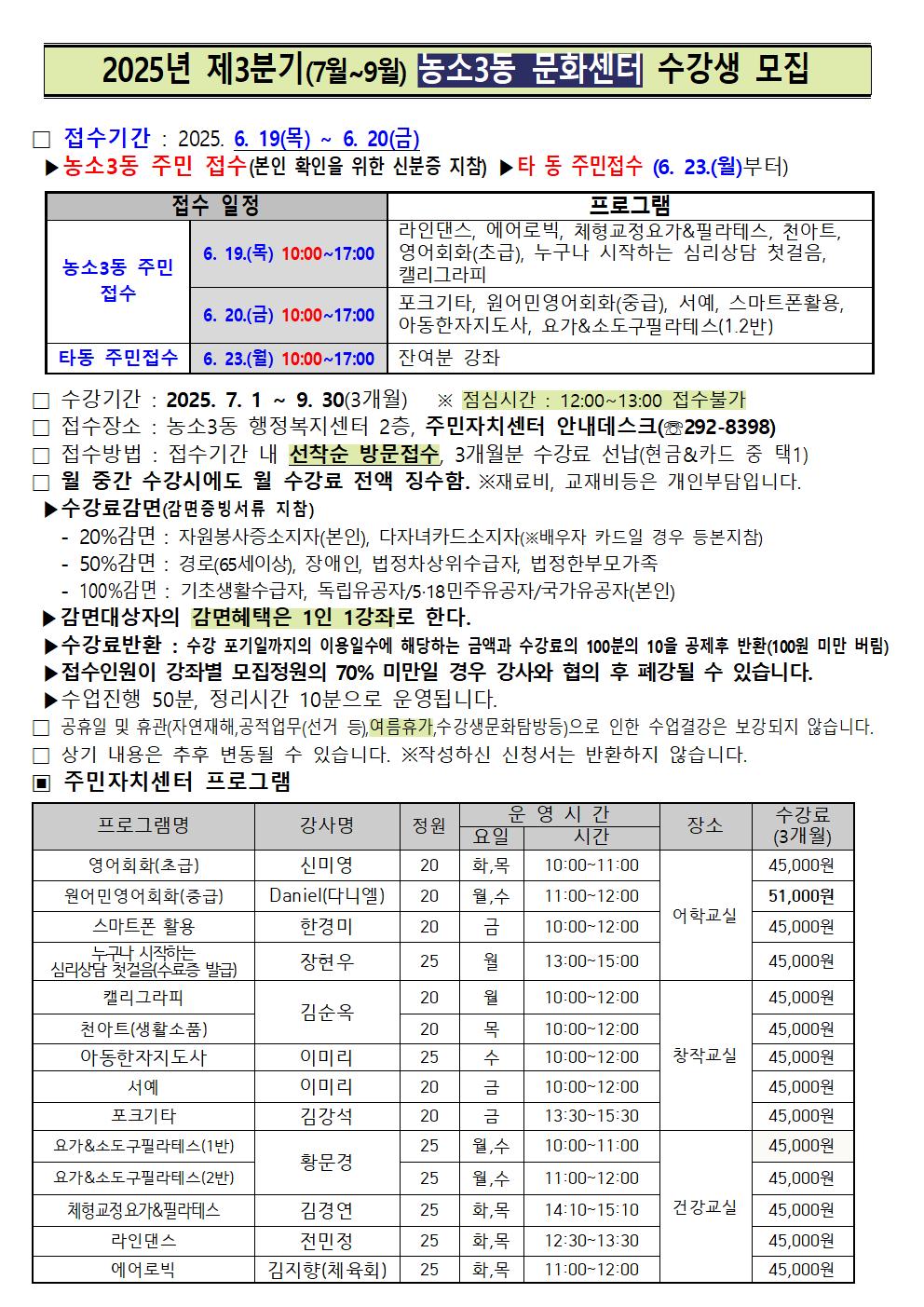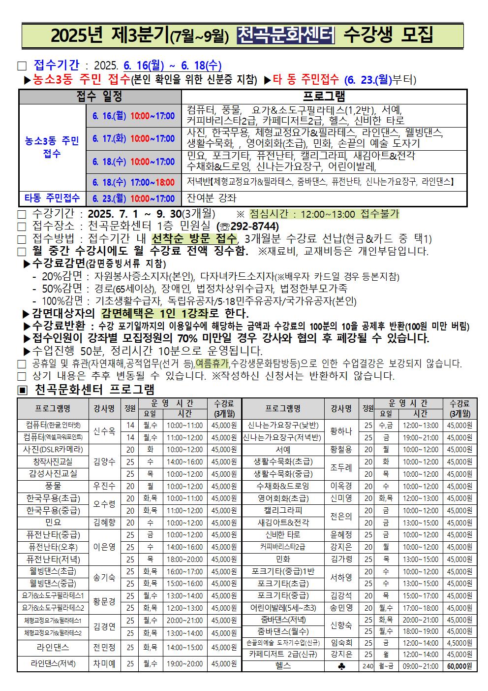 2025년 3분기 농소3동 주민자치센터 및 천곡문화센터 수강생 모집