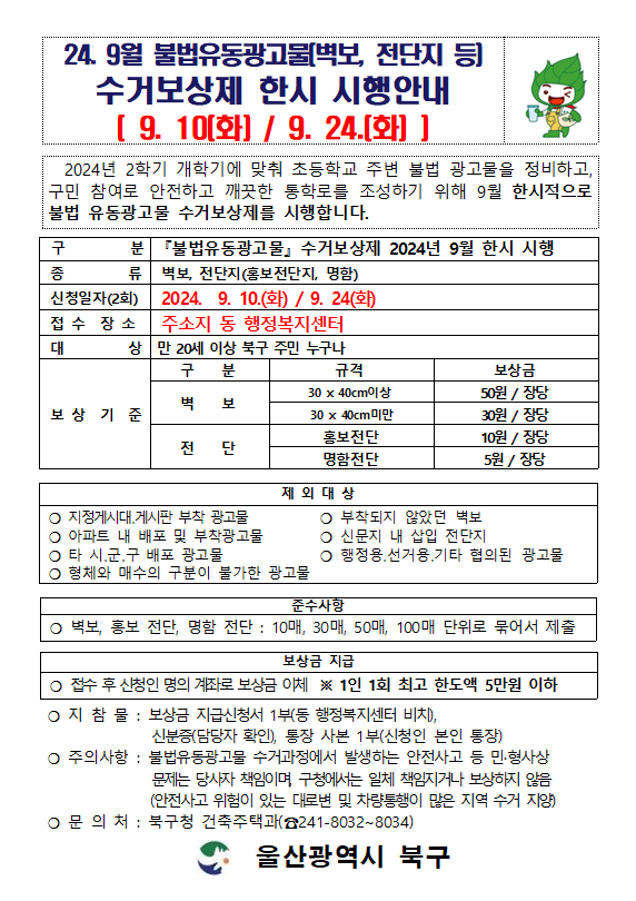 2024년 9월 불법유동광고물(벽보, 전단지 등) 수거보상제 한시 시행 안내