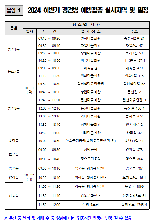 | 2024년 하반기 광견병 예방접종 실시지역 및 일정 알림 | |||