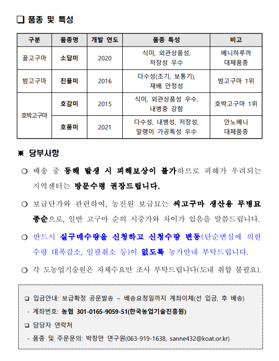 <한국농업기술진흥원 2025년 보급 고구마 모종 사전 수요조사 알림> 1. 조사기간 : ~3.11.(화) 2. 대상품종 : 호풍미, 호감미, 진율미, 소담미 3. 보급형태 및 보급단가 : 종순(품종당 100주/묶음), 350원/주 ※ 센터별 1,000주 이상 신청(기본수량 미만 시 공급 안될 수 있음) 4. 보급시기 : 2025. 4. 28. ~ 5. 29.