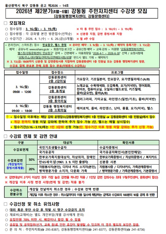 2026년 2분기(4월~6월) 강동동 주민자치센터 수강생 모집