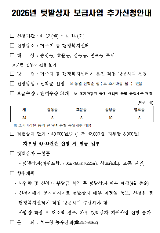 2026년 텃밭상자 보급사업 추가신청안내(4.13.~4.14., 선착순신청)