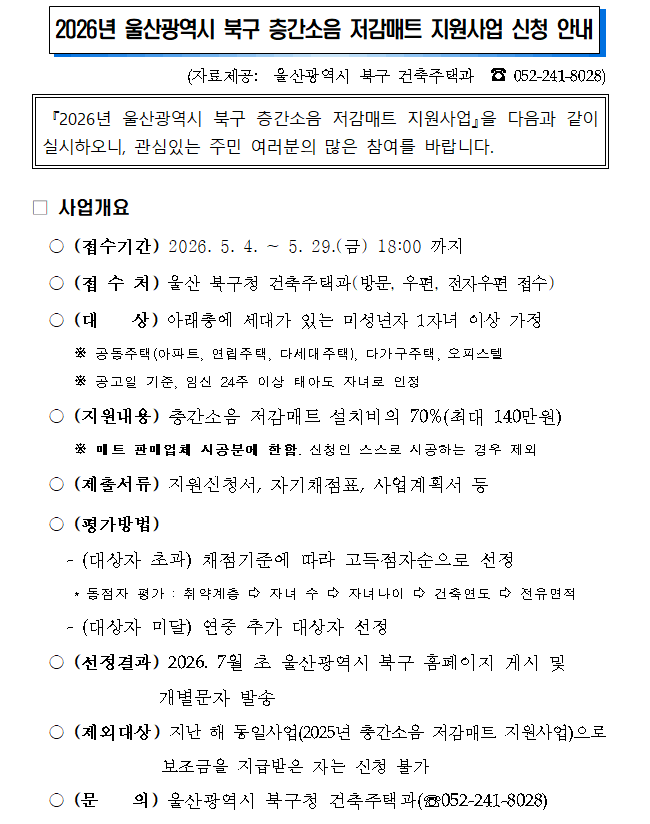 2026년 울산광역시 북구 층간소음 저감매트 지원사업 신청 안내