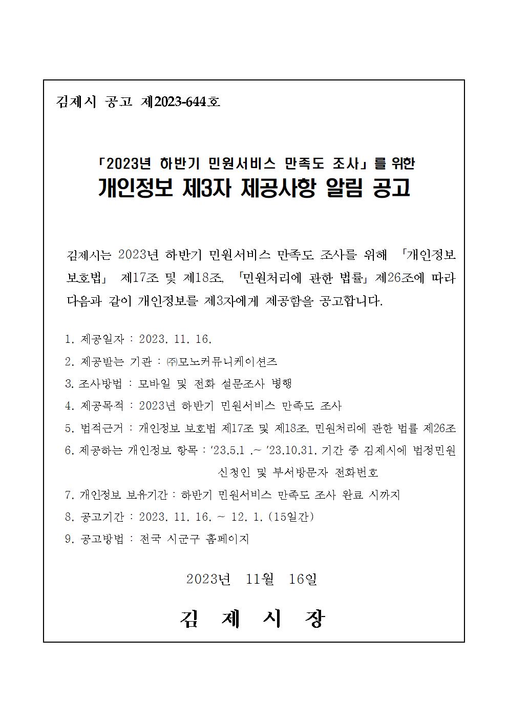 「2023년 하반기 민원서비스 만족도 조사」를 위한 개인정보 제3자 제공사항 알림(김제시 공고 제2023-644호)