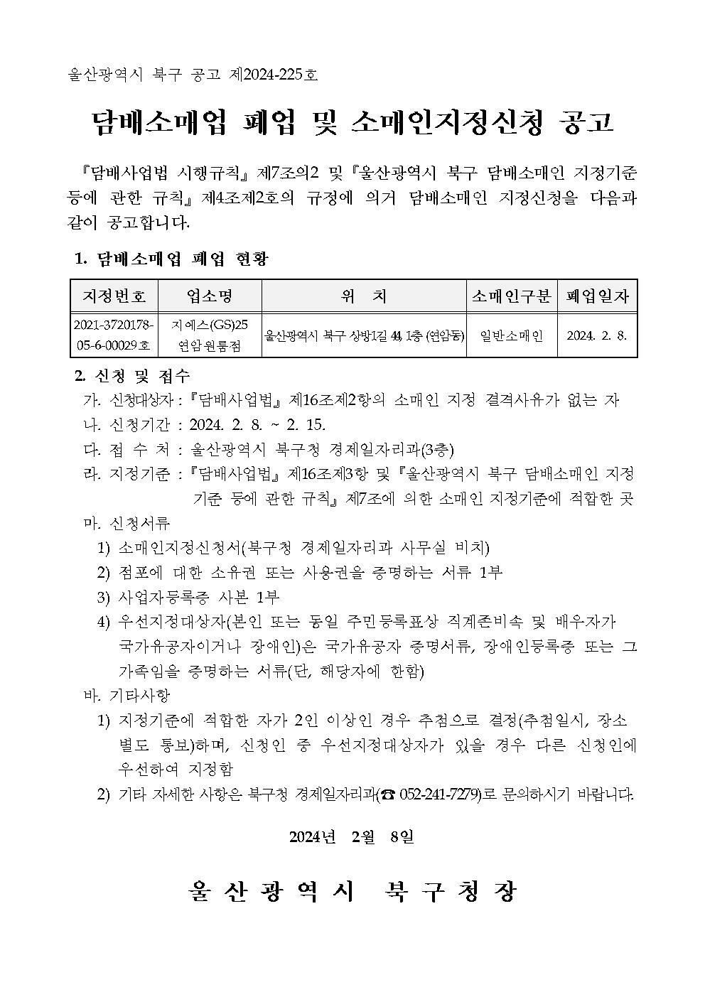 담배소매업 폐업 및 소매인지정신청 공고