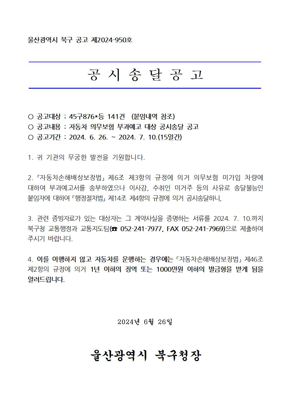 자동차 의무보험 부과예고 대상 공시송달 공고