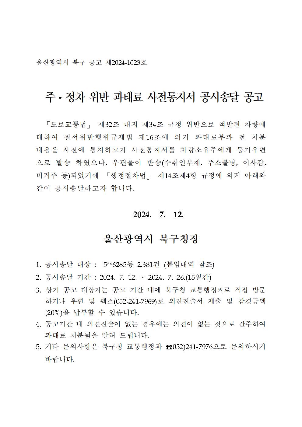 240712 울산북구(교행) 주정차위반과태료 사전통지서 공시송달 명단.xlsx