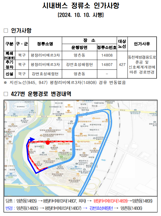 시내버스 427번 노선변경 신설,폐쇄,추가 정차 안내