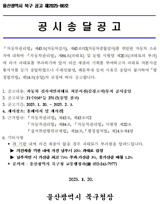 자동차 검사지연과태료 처분사전(감경고지)통지 공시송달 공고