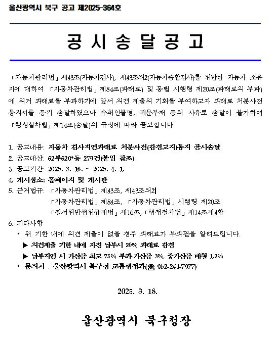 자동차 검사지연과태료 처분사전(감경고지) 통지 공시송달 공고