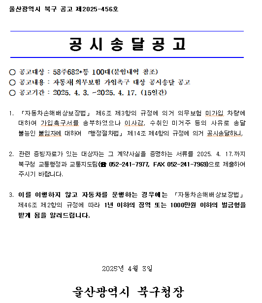 자동차 의무보험 가입촉구 대상 공시송달 공고