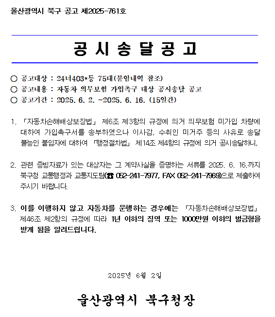 자동차 의무보험 가입촉구 대상 공시송달 공고