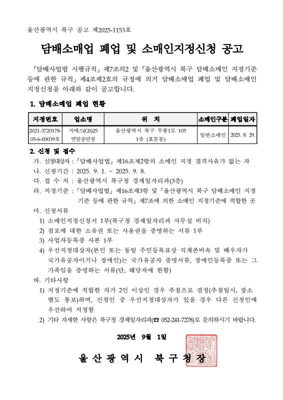 담배소매업 폐업 및 소매인지정신청 공고