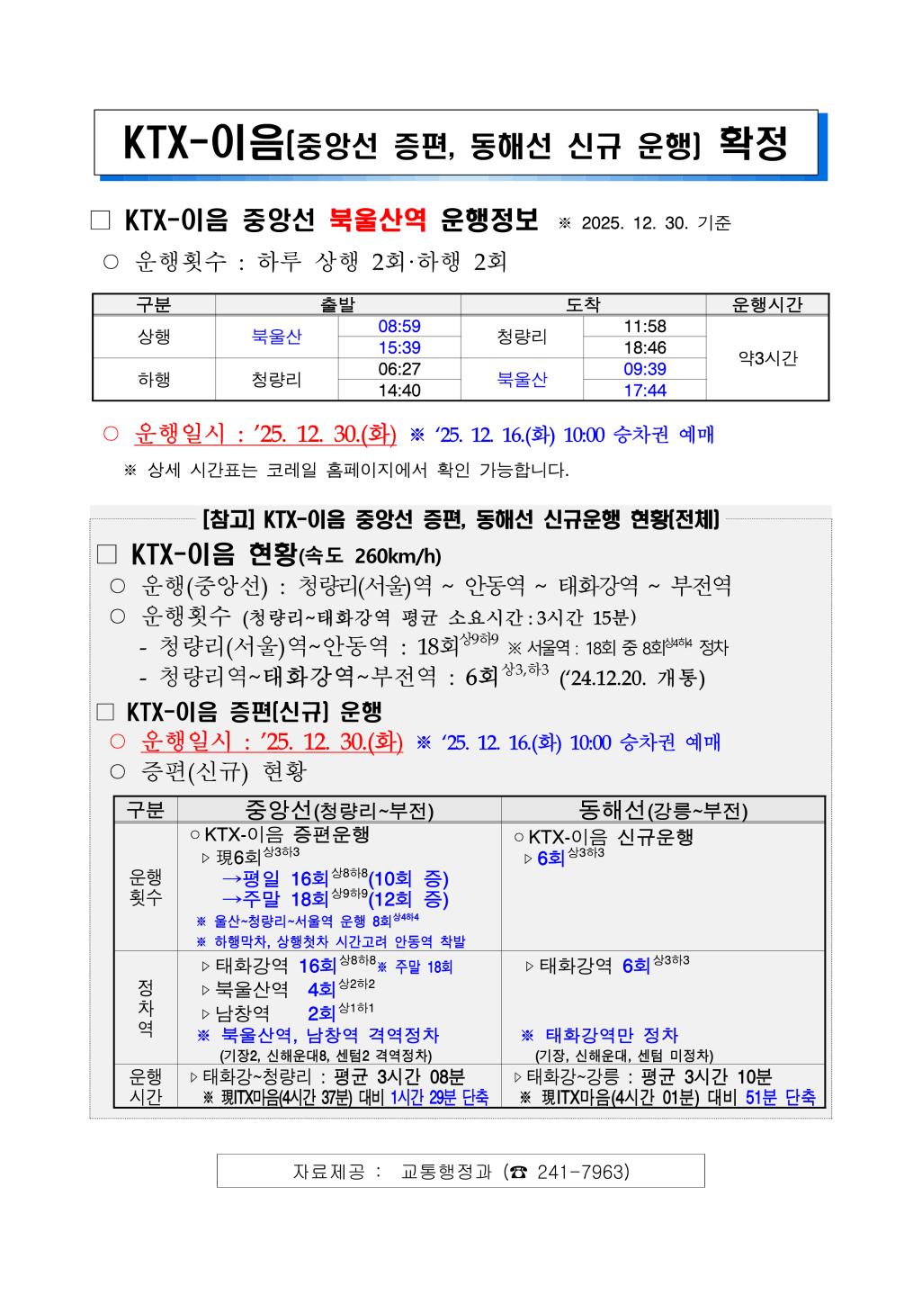KTX-이음 중앙선 증편, 동해선 신규운행 안내