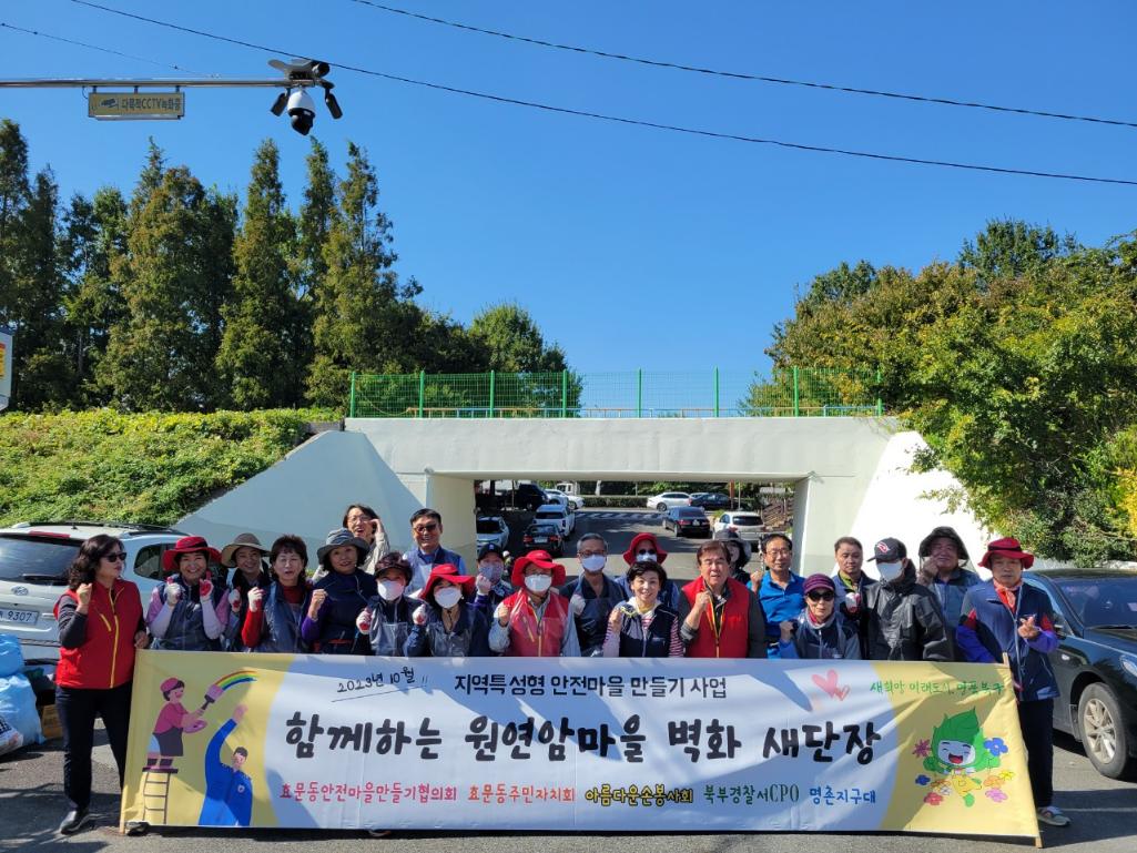 ○ 일시/장소 : 2023. 10. 16.(월) 10:00 ~ 12:00 / 원연암마을 ○ 행사명 : 효문동 안전마을 만들기 협의회 원연암마을 벽화그리기 행사 ○ 참여자 : 효문동 안전마을 만들기 협의회(주민자치회), 아름다운손봉사회, 북부경찰서 CPO