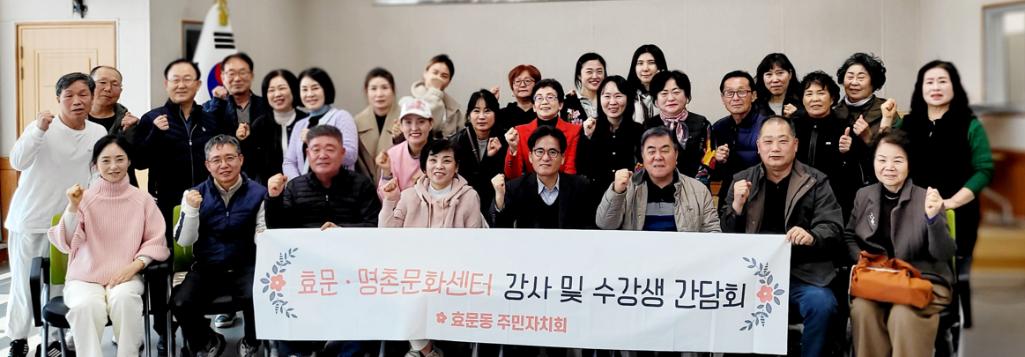 □ 2025년 상반기 주민자치센터 강사 및 수강생 간담회 개최 ○ 일 시 : 2025. 3. 11.(화) 11:00 ○ 장 소 : 명촌문화센터 3층 회의실 ○ 참석대상 : 강사 및 수강생 대표 22명, 주민자치회 임원진, 동장 등 ○ 주요내용 : 주민자치센터 운영 및 이용에 관한 의견 수렴 등 |