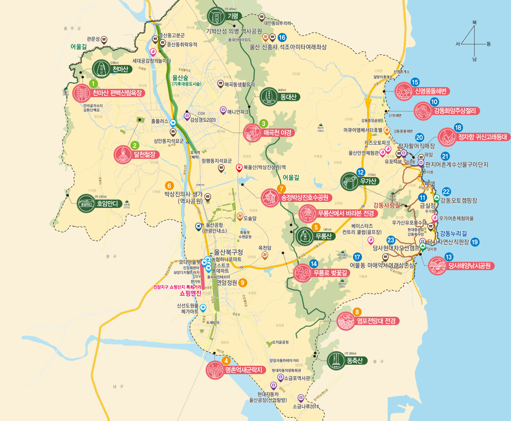 북구 중산동(동대산) ∼ 울주군 두동면(치술령 망부석) |