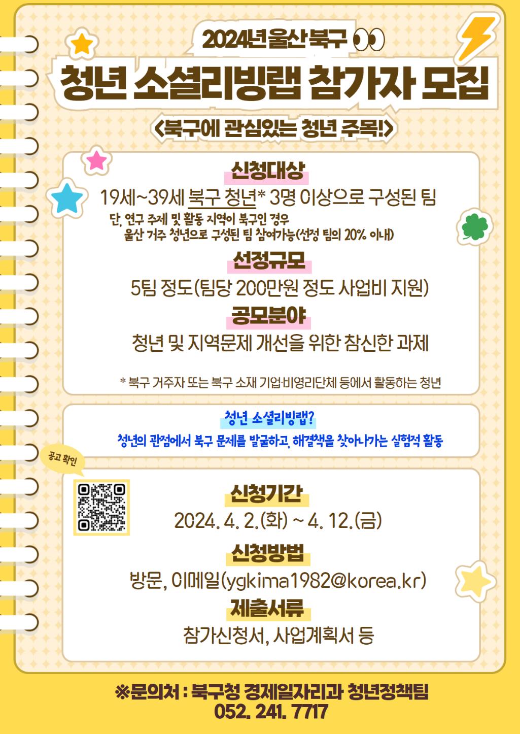 □ 사 업 명 : 울산 북구 청년 소셜리빙랩 “청년연구단” 운영 □ 사업기간 : 2024. 3. ~ 12. □ 신청대상 : 19세 ~ 39세* 북구 청년** 3명 이상으로 구성된 팀 단, 연구 주제 및 활동 지역이 북구인 경우 울산 거주 청년으로 구성된 팀의 참여 가능(선정 팀의 20% 이내) * 생년월일 기준 : 1984. 1. 1. ~ 2004. 12. 31. ** 북구 거주자 또는 북구 소재 기업·비영리단체 등에서 활동하는 청년 □ 공모분야 : 청년 및 지역문제 개선을 위한 참신한 과제 □ 선정규모 : 5팀 정도(팀 당 200만원 정도 사업비 지원) ※ 심사결과에 따라 사업비 조정 가능 □ 사업내용 : 청년이 주도하여 북구 문제를 발굴하고, 청년만의 독특한 아이디어로 새로운 대안마련을 위한 활동 지원 □ 접수기간 : 2024. 4. 2.(화) ~ 4. 12.(금) □ 제출서류 : 참가신청서, 사업계획서, 개인정보 수집 및 활용동의서, 관련 증빙서류(재직증명서, 활동증명서 등) □ 제출방법 : 방문 및 이메일접수(ygkima1982@korea.kr) ※ 메일 발송 후 확인전화 필수 □ 문의전화 : ☎ 052-241-7717(경제일자리과 청년정책팀)