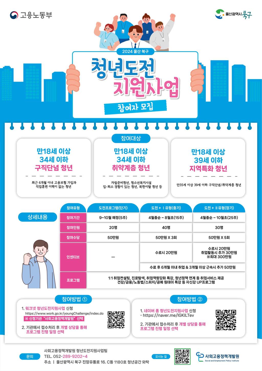 <2024년 청년도전지원사업 참여자 모집 안내> - 대 상: 구직단념청년 등 18세~39세 청년 - 지원내용: 맞춤형 프로그램, 참여수당 등 제공 - 위 치: 청년공간 와락(진장유통로 16 c동 1180호) - 신청방법: 워크넷 및 네이버폼 신청 - 문의전화: 052-289-9202~4