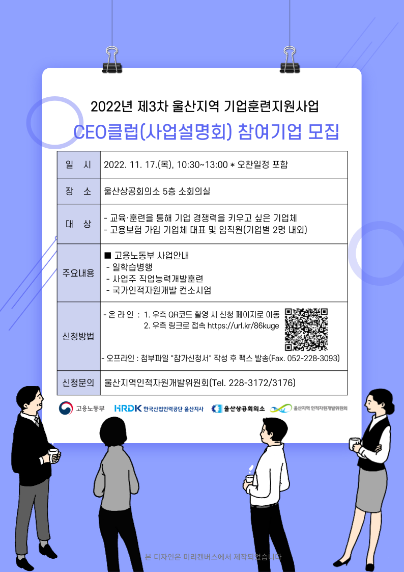 | 2022년 제3차 울산지역 기업훈련지원사업 CEO클럽(사업설명회) 참여기업 모집 | |||||
