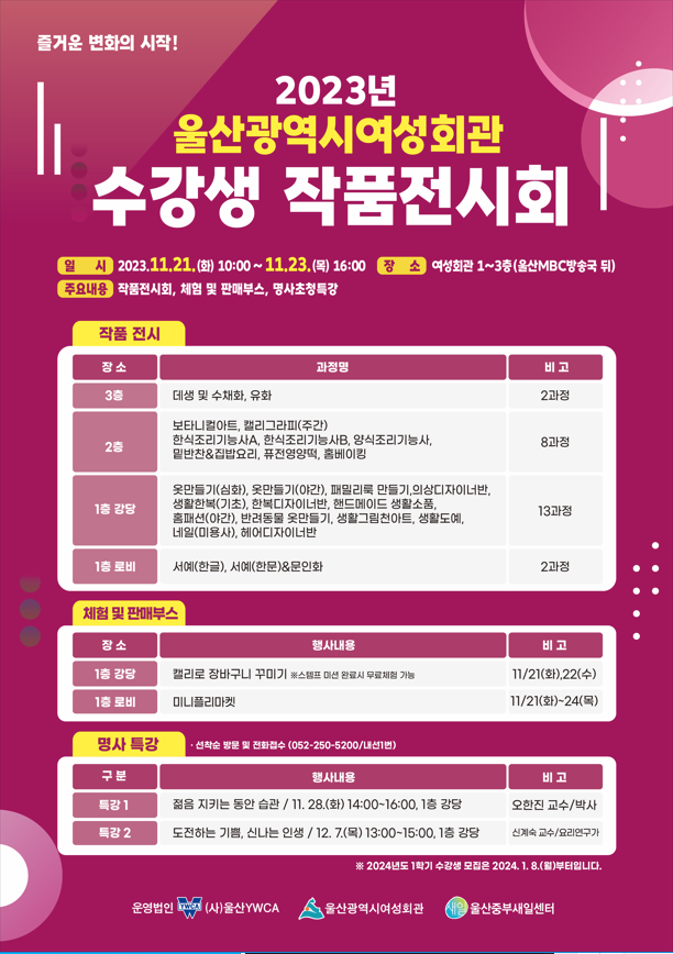| 2023년 울산광역시여성회관 수강생 작품전시회 안내 | |||