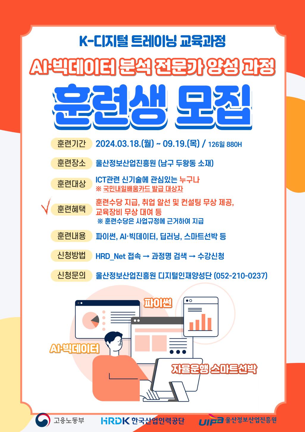 | 2024년 K-디지털 트레이닝 'AI·빅데이터 분석 전문가 양성 과정' 훈련생 모집 안내 | |||