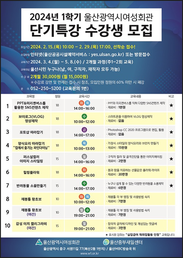 | 2024년 1학기 울산광역시여성회관 단기특강 수강생 모집 안내 | |||