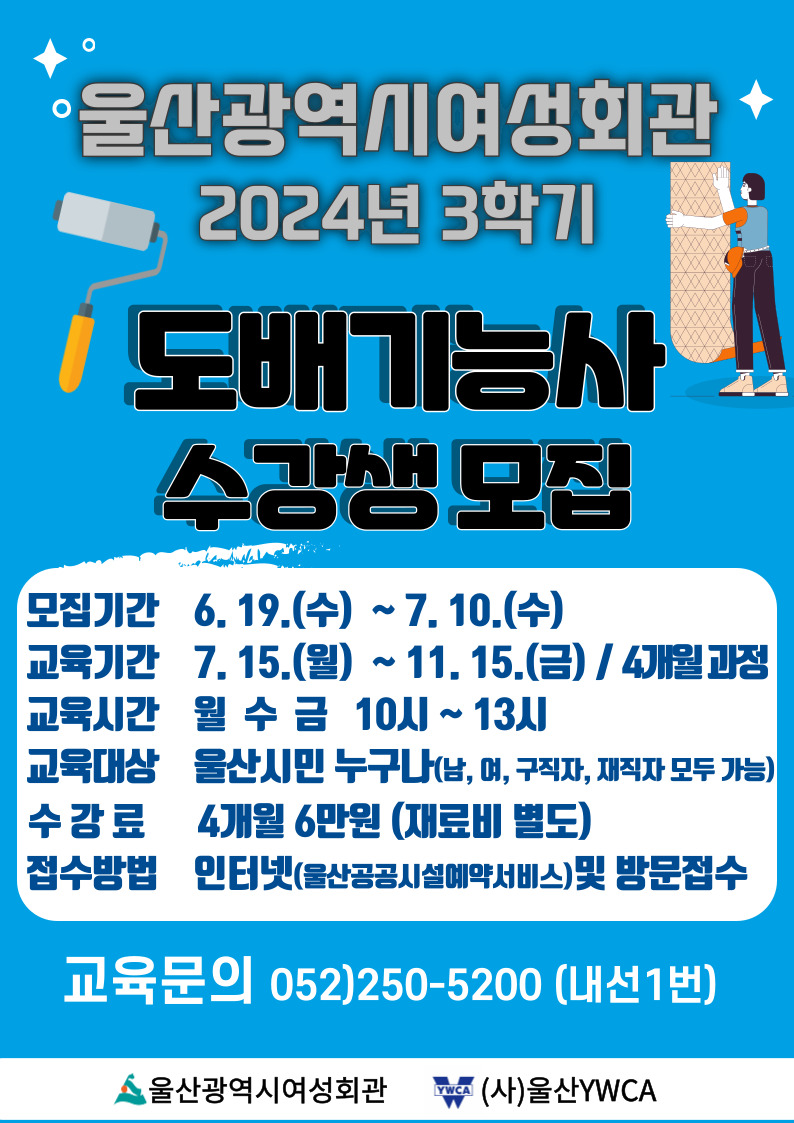 | 울산광역시 여성회관 2024년 3학기 도배기능사 수강생 모집 안내 | |||