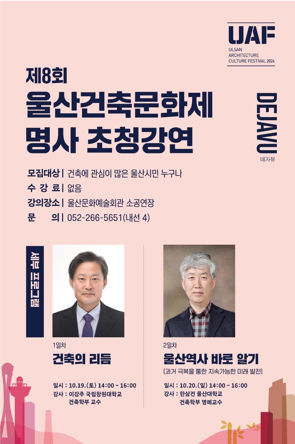 <2024년 제8회 울산건축문화제 명사 초청강연> - 모집대상 : 건축에 관심이 많은 울산시민 누구나 - 수강료 : 없음 - 강의장소 : 울산문화예술회관 소공연장 - 문의 : 052-266-5651(내선4)