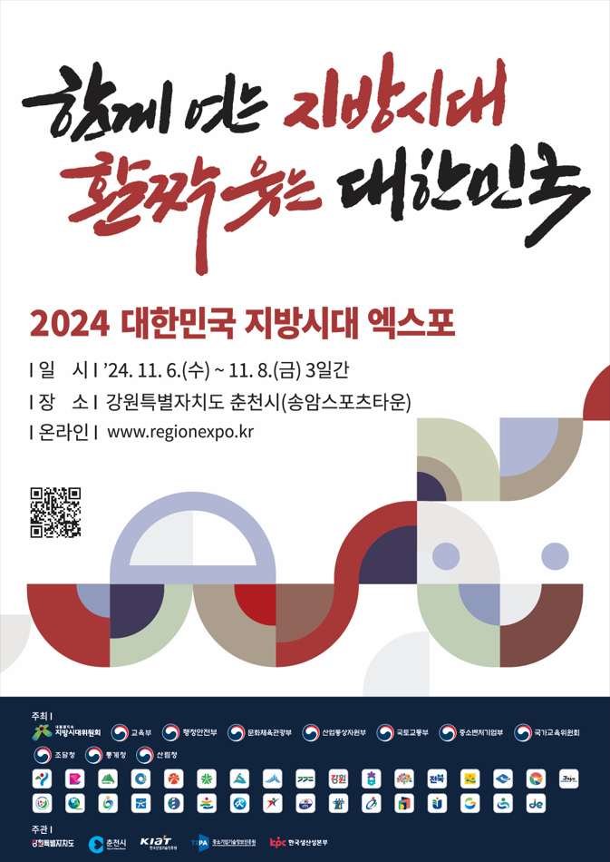 <2024 대한민국 지방시대 엑스포 안내> 함께 여는 지방시대 활짝 웃는 대한민국 - 일시 : '24.11.6.(수) ~ 11.8.(금) 3일간 - 장소 : 강원특별자치도 춘천시 (송암스포츠타운) - 온라인 : www.regionexpo.kr