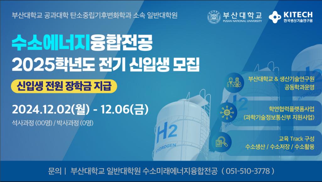 부산대 - 생기원 융합대학원 수소에너지융합전공 2025학년도 전기 신입생 모집 (신입생 전원 장학금 지급) 2024.12.02.(월) ~ 12.06.(금) ☎ 문 의 : 부산대학교 일반대학원 수소미래에너지융합전공 (051-510-3778)