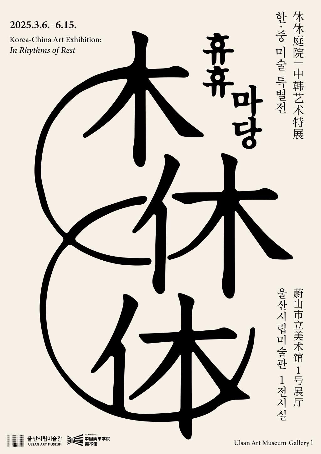 한·중 미술 특별전《휴휴休休마당》 In the Rhythm of Rest : Special Exhibition of Korean-Chinese Art 2025년 울산시립미술관 한·중 미술 특별전 [휴휴休休마당] 한?중 미술 특별전 <휴휴休休마당>은 자연과 인간의 관계를 탐구하며 정신적인 자유와 평안을 찾는 과정을 중심으로 전개됩니다. ‘쉬고(休), 또 쉬는(休) 마당’은 미움과 어리석은 마음의 번뇌를 내려놓고 고요히 자신을 바라보는 평화가 모두에게 깃들기를 바라는 마음으로 기획된 전시입니다. 산과 같은 거대한 고요함, 대지와 바다를 순환하는 물의 변신(變身)은 무한한 경이로움을 불러일으킵니다. 자연과의 교감을 통해 마음으로 이어지는 몰입과 유희, 정신의 자유가 우리의 삶을 더욱 풍성하고 의미 있게 채워줍니다. 이번 전시는 현대 사회의 복잡함과 과잉에 지친 이들에게 사색의 여운을 남기고 실천적인 가치를 발견할 수 있도록 쉴 자리를 내어줍니다. 일상의 소음에서 잠시 벗어나 자연의 본질과 인간 본연의 가치를 되새기며, 세상을 보다 유연하고 겸허하게 바라보는 계기가 되기를 바랍니다. 전시문의: 229-8422