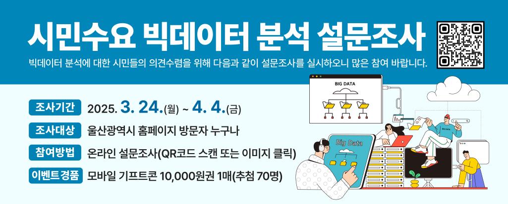 <빅데이터 분석 수요 설문조사> 빅데이터 분석에 대한 시민들의 의견수렴을 위해 다음과 같이 설문조사를 실시하오니 많은 참여 바랍니다. ○ 조사기간 : 2025. 3. 24.(월)~4. 4.(금) ○ 조사대상 : 울산광역시 홈페이지 방문자 누구나 ○ 참여방법 : 온라인 설문조사 ○ 이벤트 경품: 모바일 기프트콘 1매(70명) ○ 설문조사 연결주소 : https://forms.gle/BBEeDvS9Wc9q3Tzb9 - 울 산 광 역 시 -