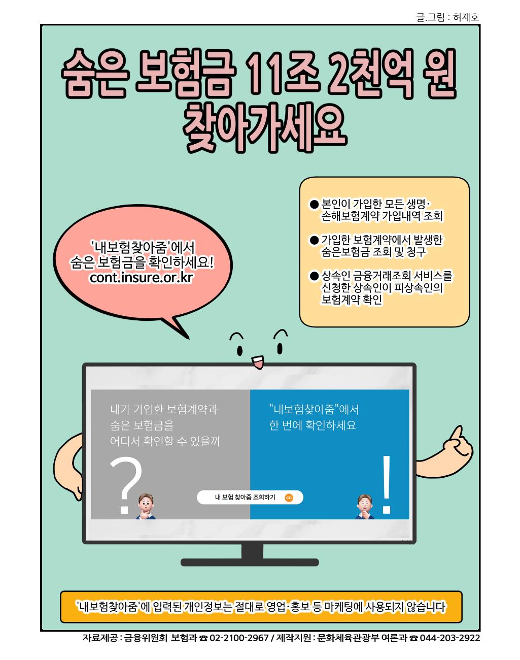 - 숨은 보험금 11조 2천억 원 찾아가세요 - '내보험찾아줌' 에서 숨은 보험금을 확인하세요! * 금융위원회 보험과 ☎ 02-2100-2967 |