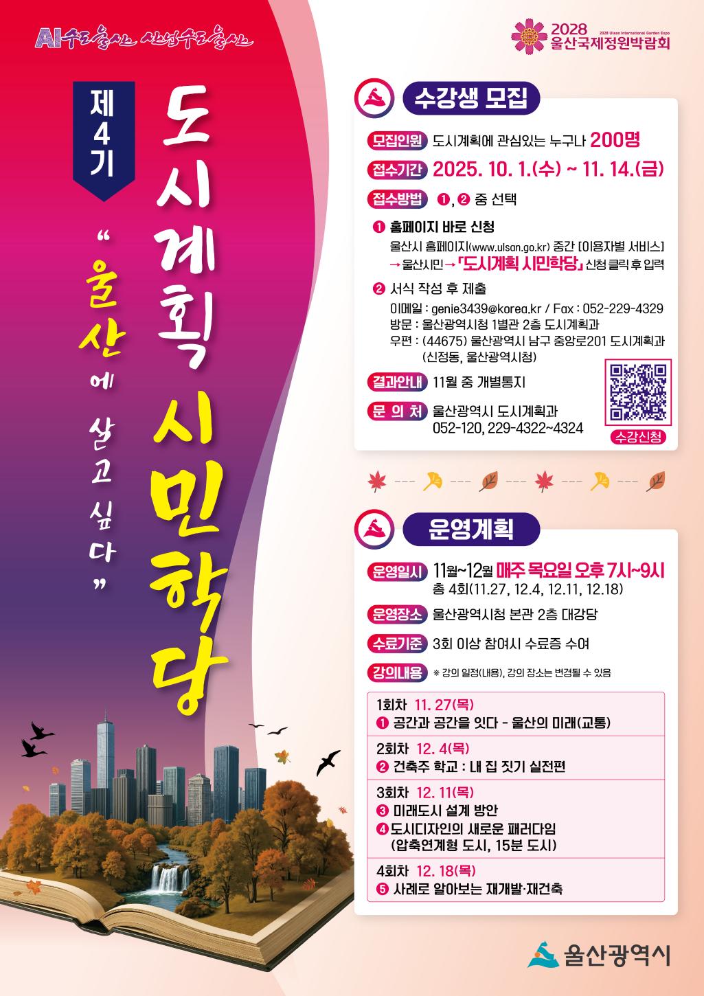 제4기 도시계획 시민학당 수강생 모집 - 모집인원 : 200명 /접수기간 : 2025. 10. 1.(수). ~ 11. 14.(금) - 운영기간 : 11. 27.(목), 12. 4.(목), 12. 11.(목), 12. 18.(목), 19:00~21:00 - 신청방법 : 울산광역시 홈페이지(http://www.ulsan.go.kr) - 강의내용 : 울산의 도시비전과 도시계획 관련 전문가 강연