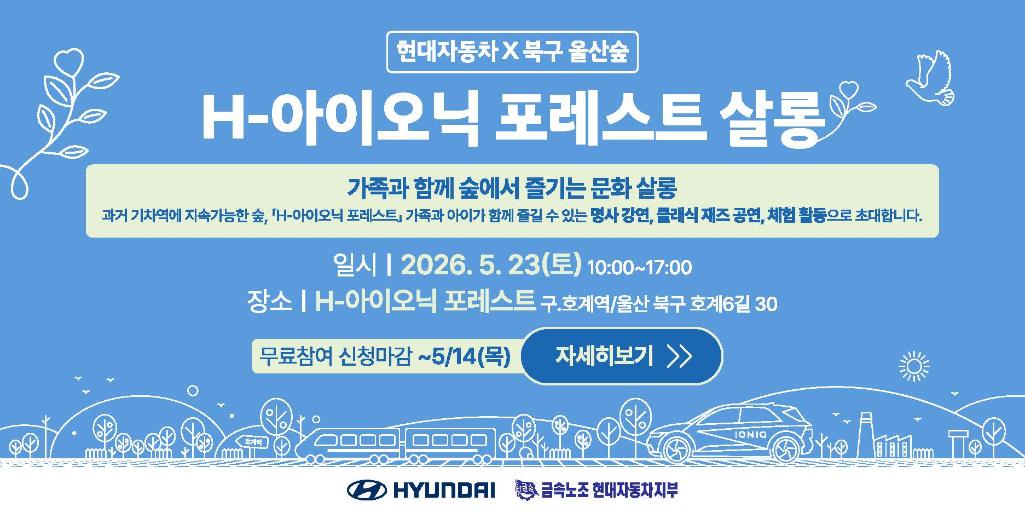 [현대자동차X북구울산숲] H-아이오닉 포레스트 살롱 가족과 함께 숲에서 즐기는 문화 살롱 과거 기차역에서 지속가능한 숲, 「H-아이오닉 포레스트」 가족과 아이가 함께 즐길 수 있는 명사강연, 클래식 재즈공연, 체험활동으로 초대합니다. 일시 : 2026. 5. 23.(토) 10:00~17:00 장소 : H-아이오닉 포레스트 (구. 호계역/울산 북구 호계6길 30) 무료참여 신청마감~5/14(목) 자세히보기 https://forms.gle/7hYdfVS6HnnN5PDKA 프로그램 등 자세한 내용은 붙임포스터 참조하세요