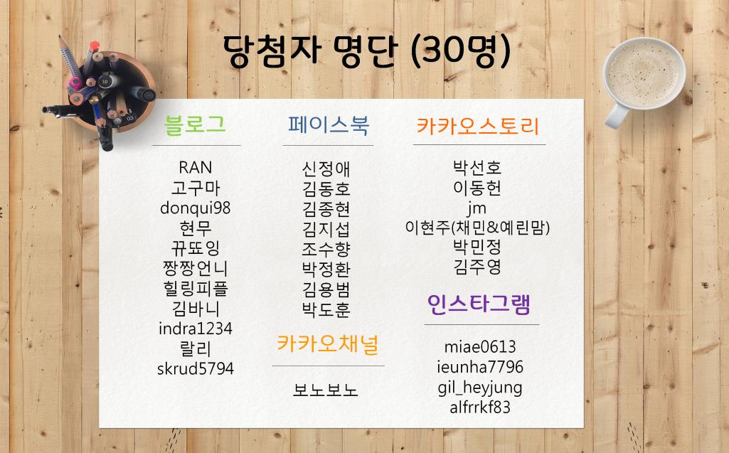 이벤트에 당첨되신 모든 분들 축하드립니다! 당첨되신 분들은 11월 10일까지 메시지(facebook, 인스타그램)나 쪽지(카카오스토리, 카카오채널), 비밀댓글(네이버 블로그)로 아래 ‘개인정보이용동의서’를 보내주세요! ※ 11월 10일까지 답장이 없을시 당첨이 취소됨을 알려드립니다.