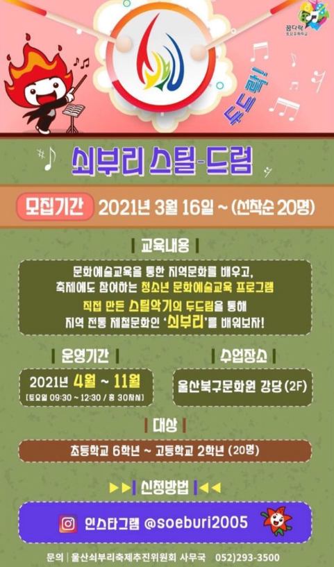 | 꿈다락 토요문화학교, 쇠부리-스틸 드럼 참여자 모집 안내 | |||