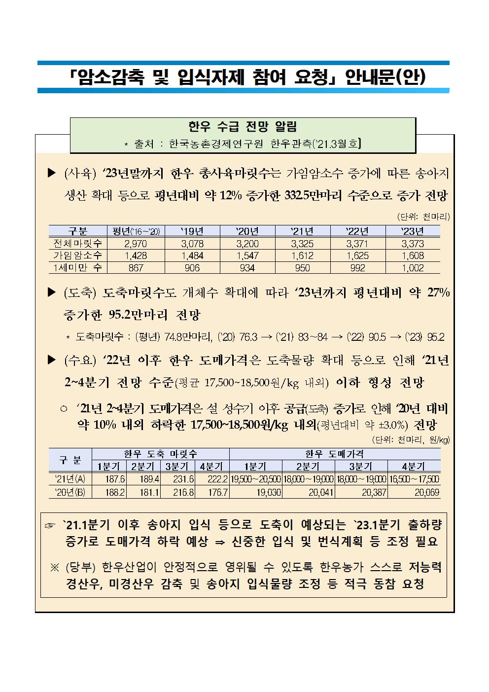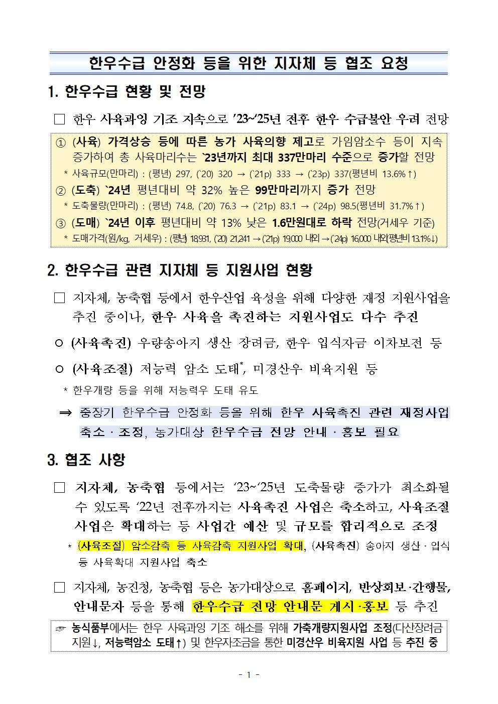 | 한우산업의 수급안정을 위한 재정 지원사업 조정 및 관측전망 홍보 | |||||