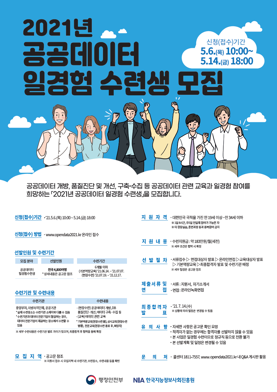 2021년 공공데이터 일경험 수련생 모집안내 - 신청(접수)기간 : 5.6.(목) 10:00 ~ 5.14.(금) 18:00 - 신청(접수)방법 : www.opendata2021.kr온라인 접수 - 지원자격 : 대한민국 국적을 가진 만19세 이상~ 만34세 이하 - 지원내용 : 수련지원금 : 약183만원/월(세전) - 선발절차 : 서류접수->면접대상자 발표->온라인면접->교육대상자발표->기본역량교육->최종합격자발표 및 수련기관배정 - 제출서류 및 면접 : 서류(지원,자기소개서), 면접(온라인녹화면접) - 최종합격자발표 : '21.7.14.(수) ☎문의 : 1811-7557, www.opendata2021.kr ※자세한내용은 첨부파일을 참고하시기 바랍니다
