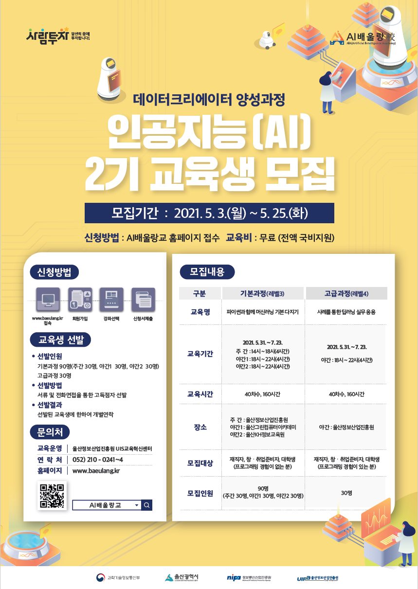 과학기술정보통신부 ‘ICT이노베이션스퀘어확산사업’ 일환으로 울산광역시에서 추진 중인 지역산업계 실무형 전문인재 양성 맞춤형 AI 교육생을 모집합니다.