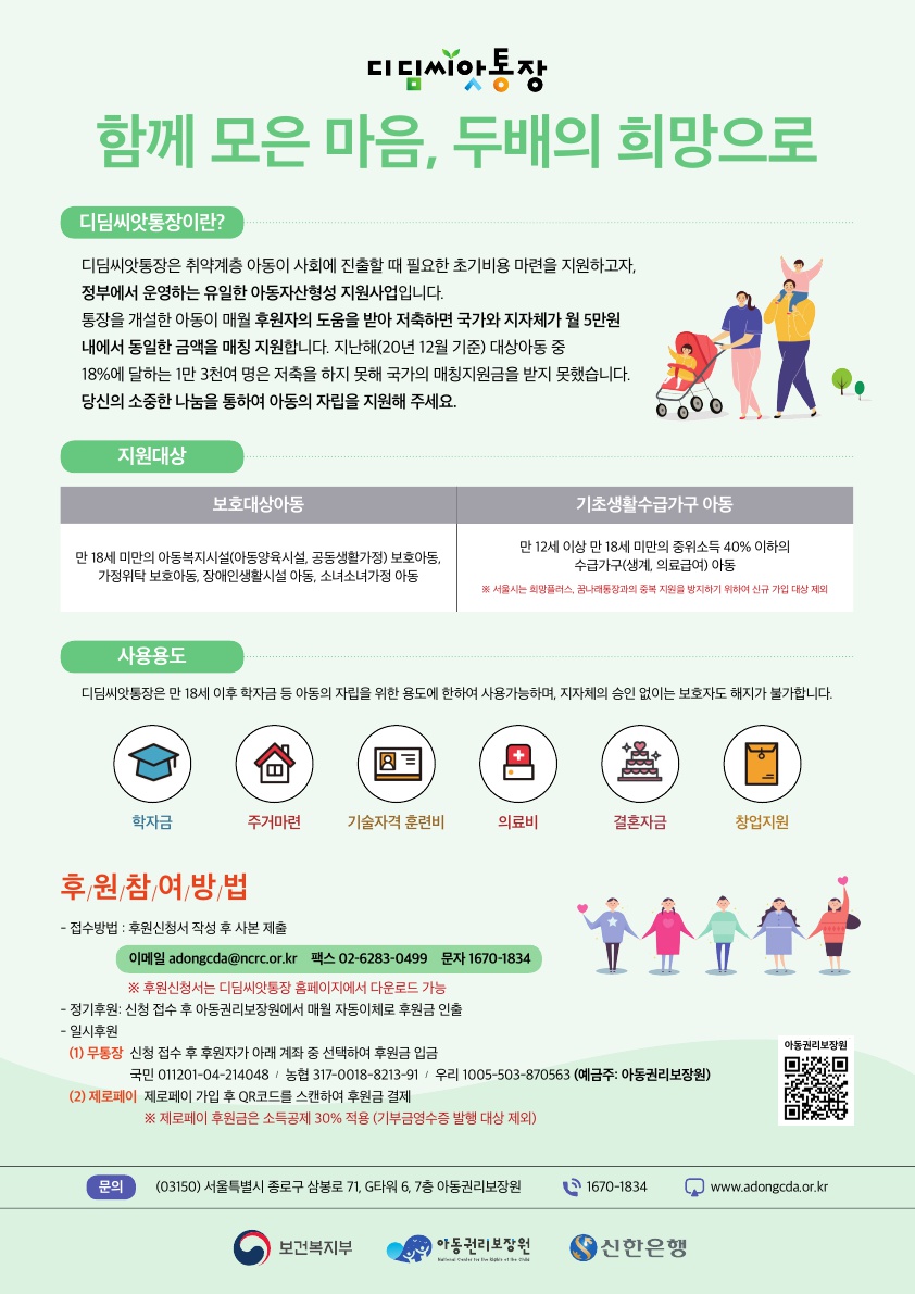 ㅇ 디딤씨앗통장이란? - 저소득층 아동의 사회진출 시 학자금, 취업, 창업, 주거마련 등에 소요되는 초기비용 마련을 위한 자산형성 사업으로 아동의 적립예금(후원포함)에 대해 지자체가 1:2 비율로 월 최대 10만원 한도내 매칭금을 지원하여 적립해주는 사업 ㅇ 적립금 사용용도 : 만18세 이후 학자금, 기술자격 및 취업훈련비용, 창업지원금, 주거마련 지원등으로 자립을 위한 용도에 사용 ㅇ 후원 모집 : 21. 6. 2. ~