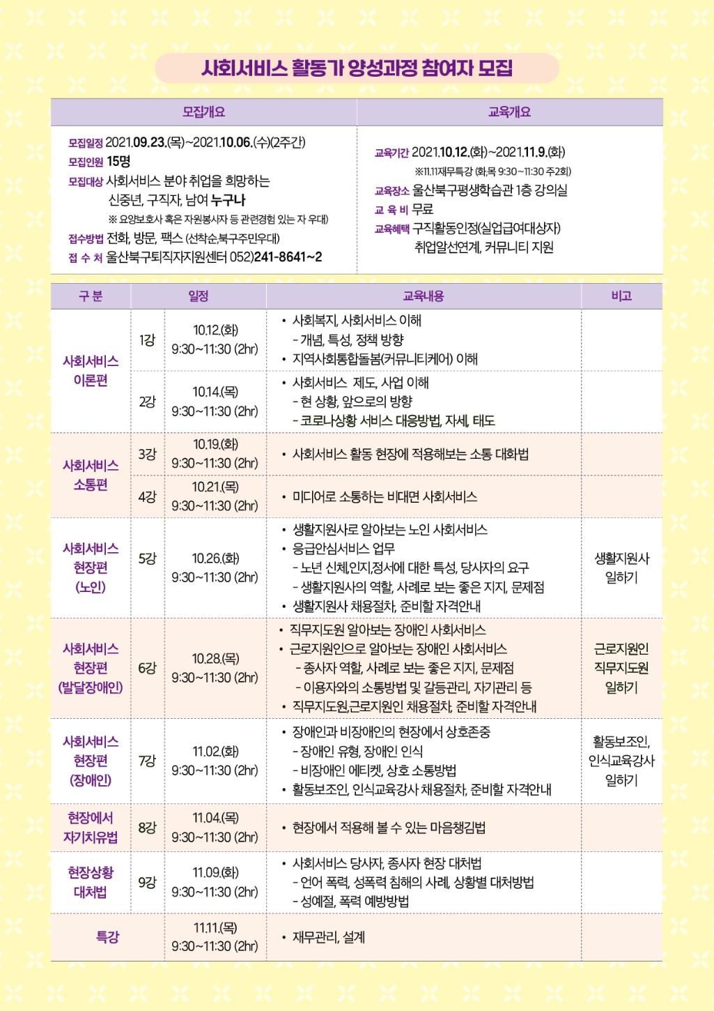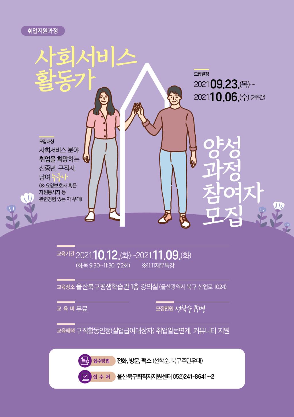 [울산북구퇴직자지원센터]취업지원과정_사회서비스활동가 양성과정 교육생 모집안내입니다.(구직활동인정 2회) ▲ 모집대상 : 신중년 구직자, 퇴직자 등 사회서비스활동가에 관심있는 누구나 ▲ 모집인원 : 15명 내외 ▲ 접수일정 : 9.23(목)~10.6(수)