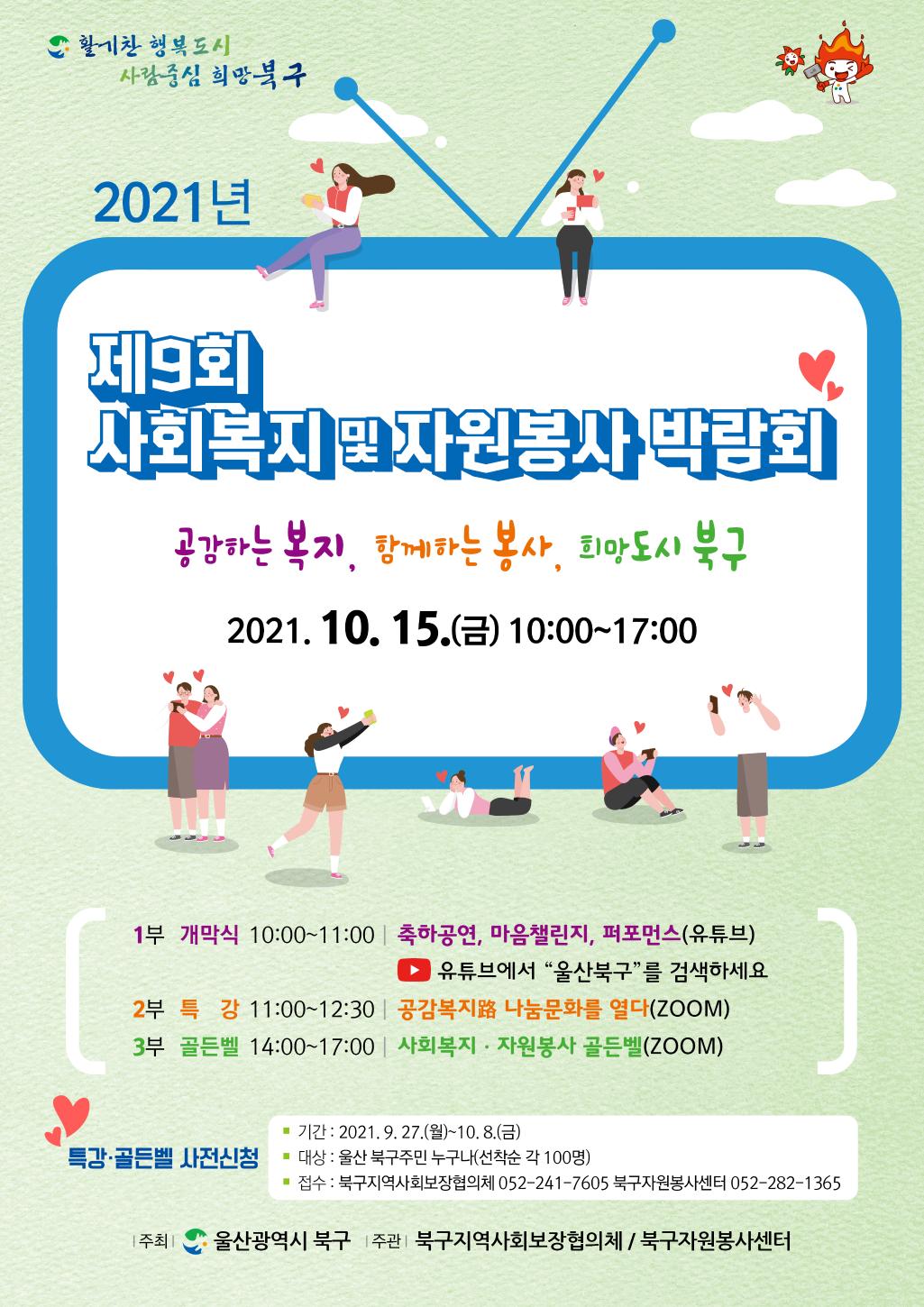 제9회 사회복지 및 자원봉사 박람회 개최 개회일시 : 10.15.(금) 10:00~17:00 1부 개막식 10:00~11:00 : 축하공연, 마음챌린지, 퍼포먼스(3개 가래떡김말이, 3색 카드섹션) 유튜브 '울산북구' 검색하세요~ 2부 특 강 11:00~12:30 : 공감복지路 나눔문화를 열다(줌) 3부 골든벨 14:00~17:00 : 사회복지 및 자원봉사 골든벨(줌)