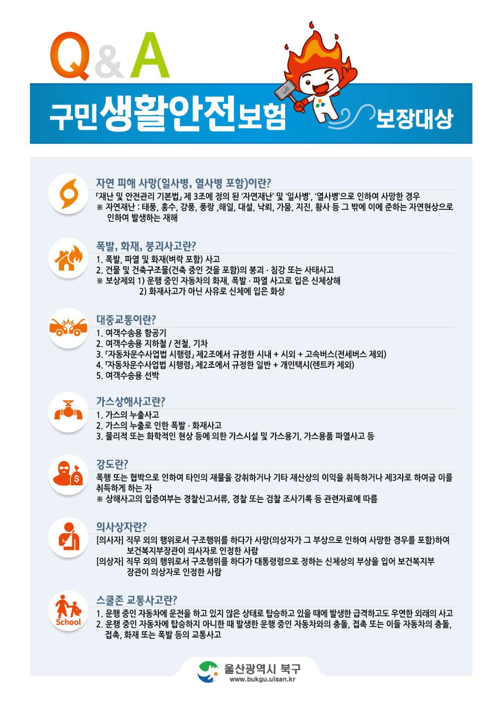 울산 북구 구민생활안전 보험에 대해 안내하오니 자세한 사항은 분야별정보>민방위/재난>생활안전보험 https://www.bukgu.ulsan.kr/lay1/S1T195C1875/contents.do 을 참고하시기 바랍니다.