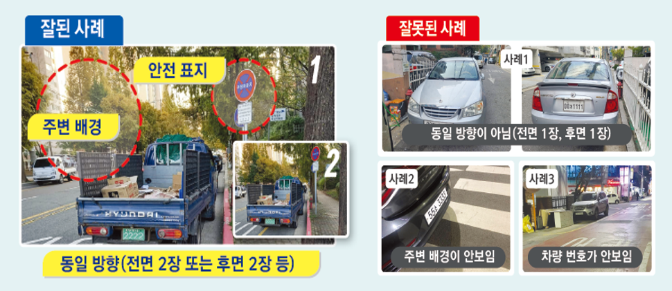 ○ 위반지역 및 차량번호가 명확히 식별 가능하며 동일 방향에서 촬영한 1분 간격의 사진 2장 필요