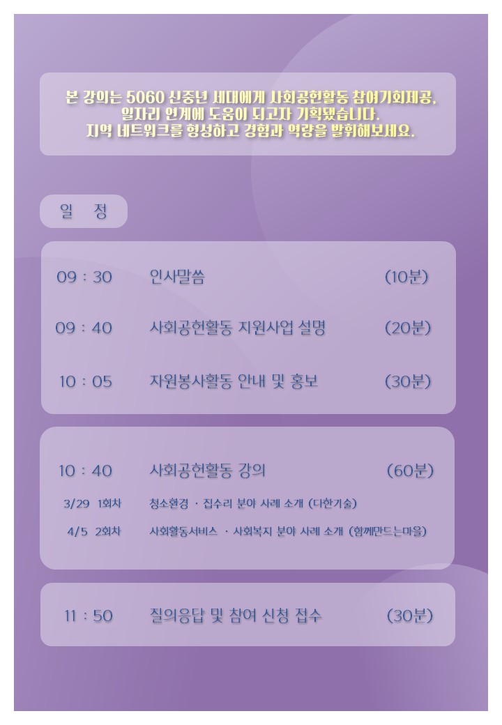 - 특강 내용 : 퇴직자 사회공헌활동 이해 및 참여, 신청, 사회적 일자리로의 방향 등에 대한 강의