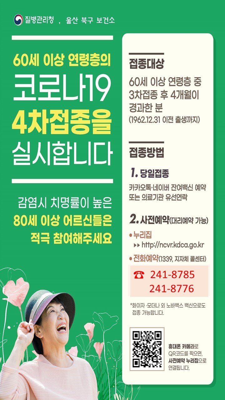 고령층의 중증, 사망 예방 및 오미크론 유행 지속, 변이바이러스 유행 등 불확실성에 대비하여 60세 이상 연령층등에 대한 코로나19 4차 예방접종을 추진하고 있사오니 접종 시 참고 하시기 바랍니다. |