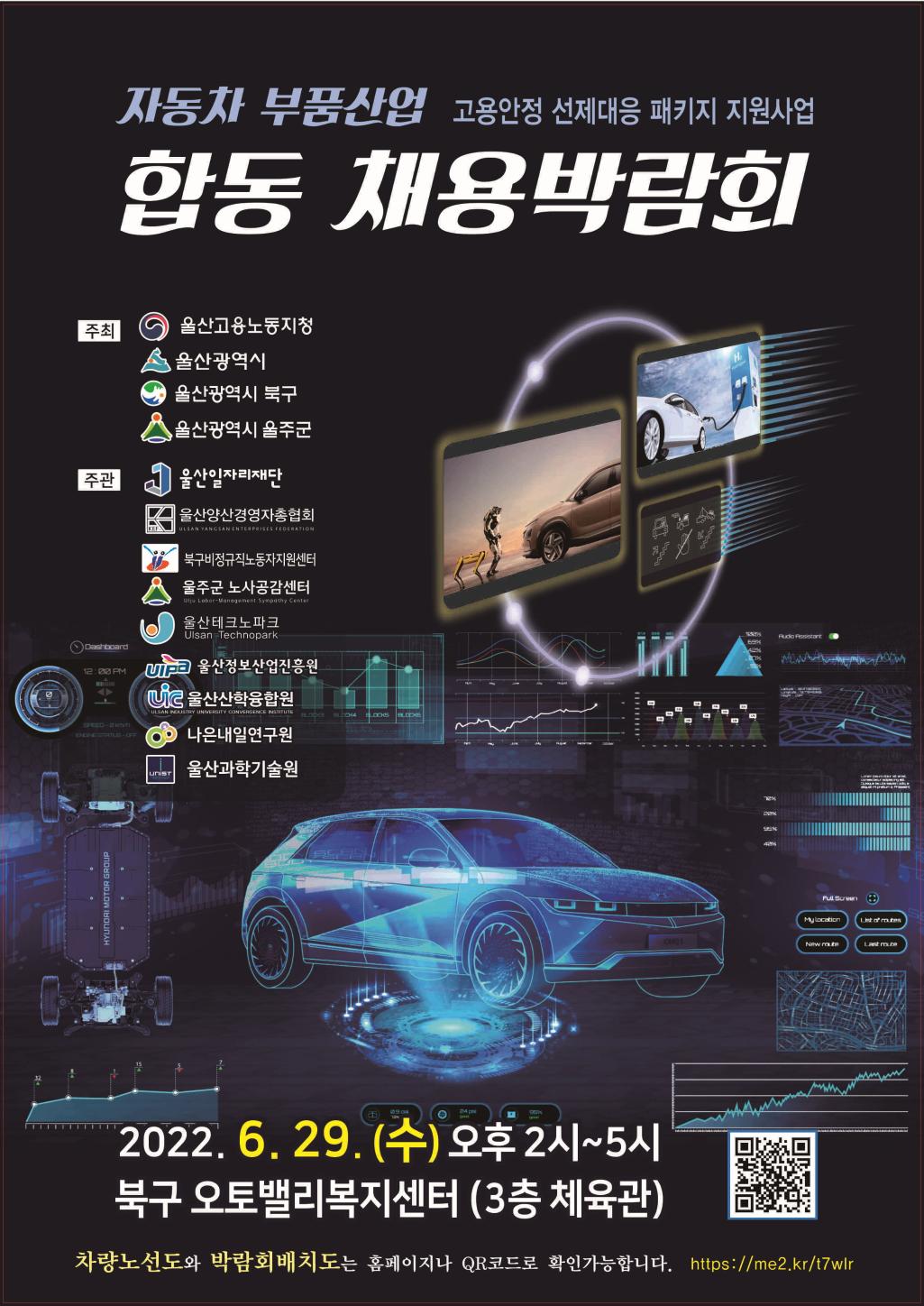 울산시-북구-울주군 컨소시엄이 추진하는 「고용안정 선제대응 패키지 지원사업」의 일환으로 자동차 부품산업 합동 채용박람회를 개최하오니 관심있는 주민여러분의 많은 참여 부탁드립니다. (QR코드 스캔시 안내 홈페이지로 이동)